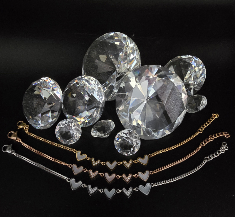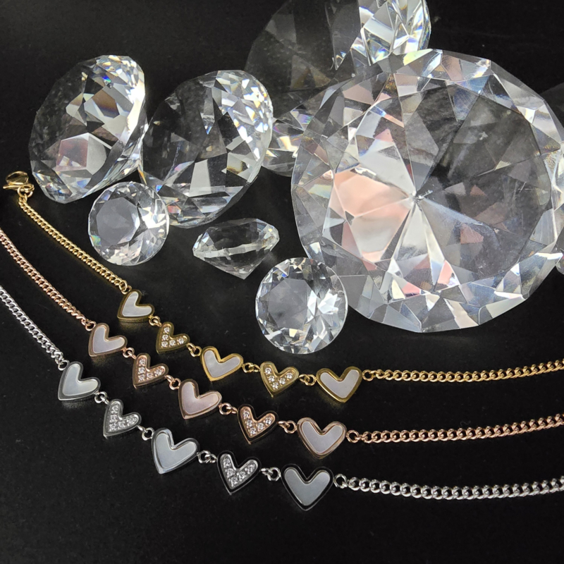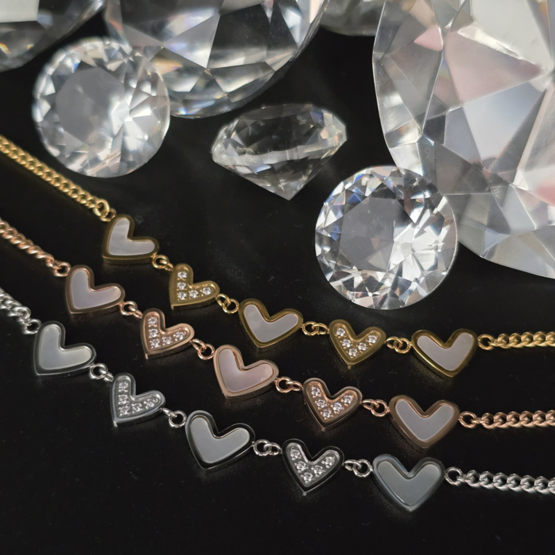 De iXXXi Armband Lover is gemaakt van stainless steel. De armband bestaat uit een fijne, platte schakel met hierop twee afwisselende hartjes: een hartje met ingelegde zirconia’s en een hartje gevuld met witkleurige shell.