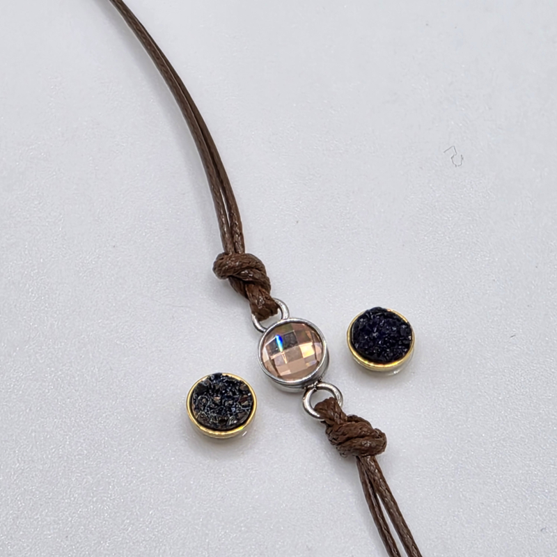 De kleur van de armband is bruin zilver en 2 top part steentjes zijn met gouden randje en 1 met zilver. Zo dus ook te combineren met goud. Voor een speelse look.