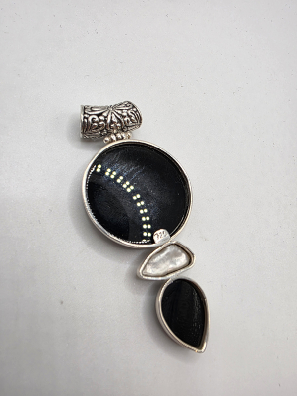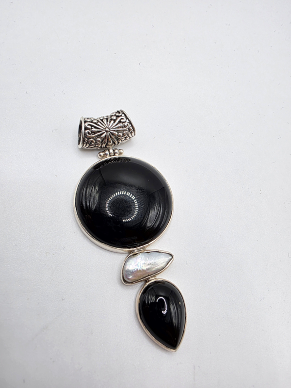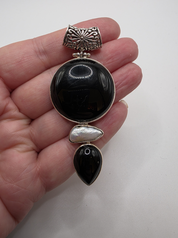 Prachtige zeer grote, echt zilveren hanger met Onyx en parel.