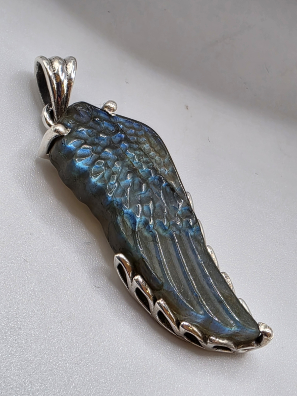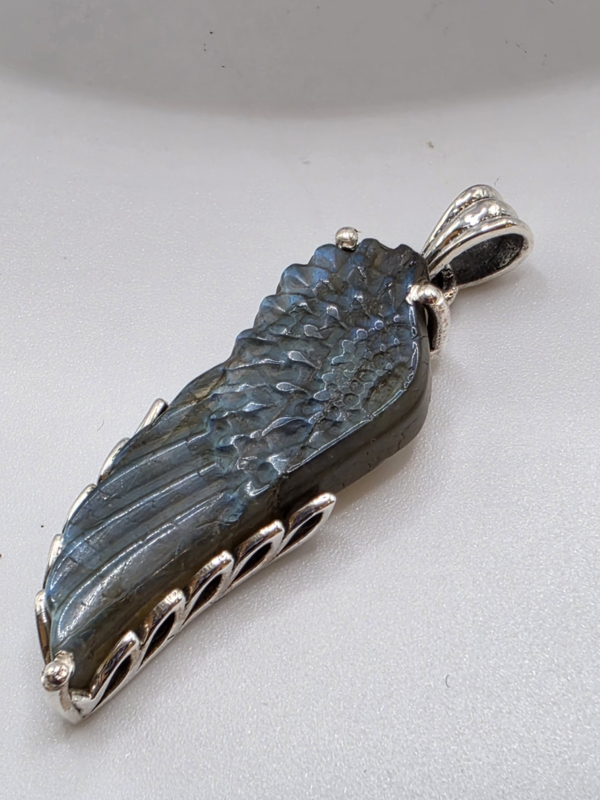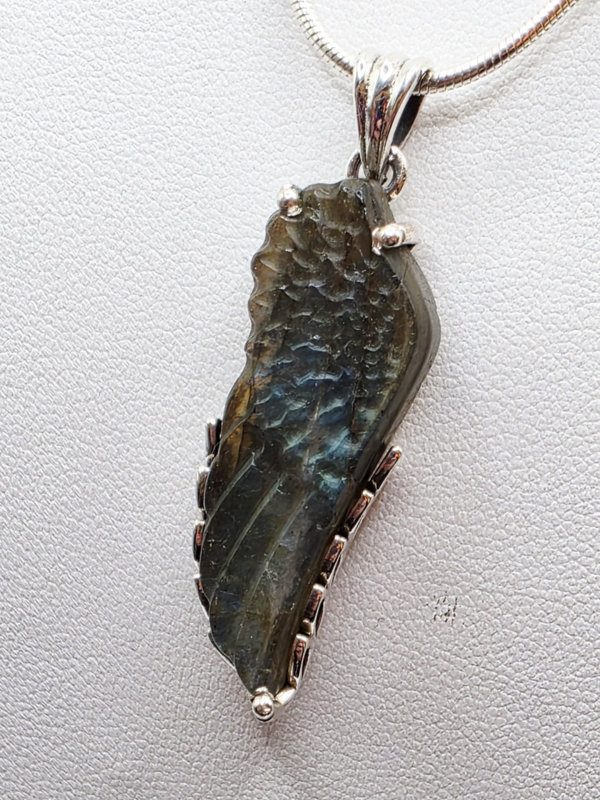 Artikelnummer: labradoriet Angel wing OverzichtPrachtig bewerkte Labradoriet hanger. Angel wing in zilver bewerkte zetkast. Zo mooi!