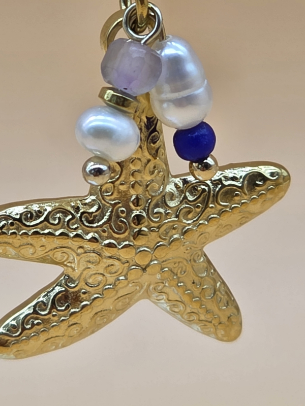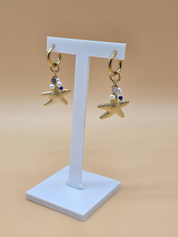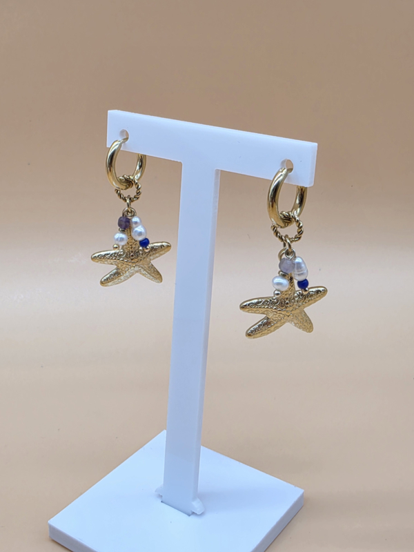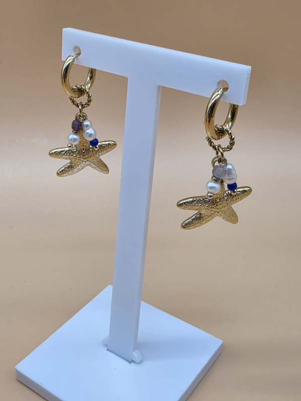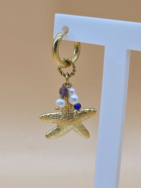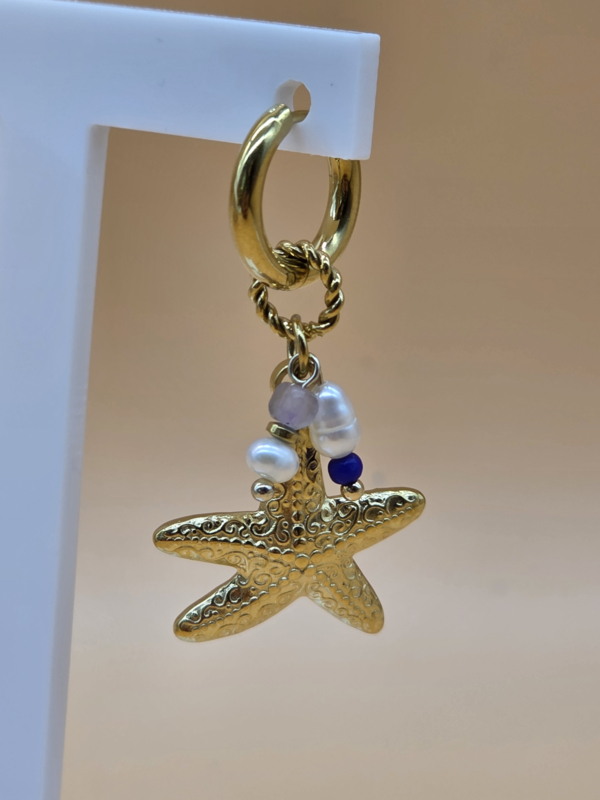 Creolen met bedeltjes in de vorm getextureerde zeesterren, zoetwaterparels, natuurlijke stenen
