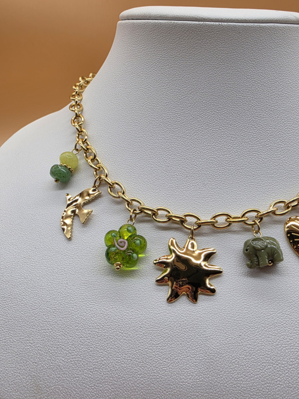 Collier met zon, bloem, olifant, hart, gegraveerde vogel, klaver