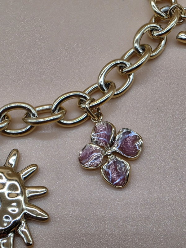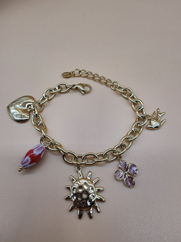Artikelnummer: BMB66290980 OverzichtArmband van roestvrijstaal. Ketting bestaande uit verschillende bedeltjes (zon, klaver, hart, vogel, bloem, geglazuurd keramiek, hars). Kettellengte: 17 cm Lengte van de verstelketting: 3 cm Totale lengte van de ketting: 20 cm Gevuld gegarandeerd nikkelvrij, cadmiumvrij, loodzoutvrij. Waterbestendig en verkleurt niet.