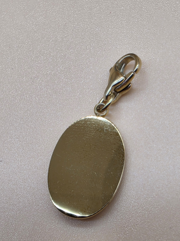 RVS bedel bestaande uit een ovale medaille met een gravure van de Madonna en een emaille rand.