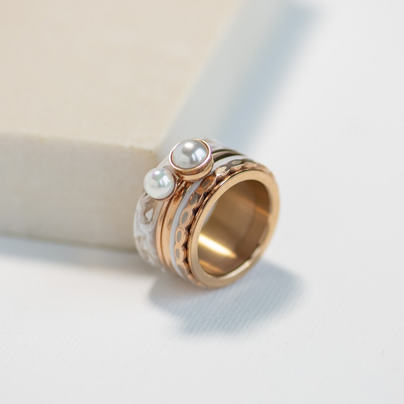 De iXXXi vulring Silence is een 1mm brede vulring gemaakt van stainless steel en is voorzien van een rosé goudkleurige plating. De vulring bestaat uit een gladde ring met een wit kleurige parel. De rosé goudkleurige vulring Silence is verkrijgbaar in de maten 14 t/m 21. Je kunt deze vulringen ook naast jouw iXXXi ringcombinatie als solitaire ringen dragen. Voeg de Silence toe aan jouw combinatie en geef je ringcombinatie net dat kleine beetje glamour wat het nodig heeft. Het toevoegen van een extra 1mm vulring aan je iXXXi ringcombinatie voorkomt dat je andere vulringen gaan draaien. De vulring Silence is er ook in de kleuren: goud en zilver.