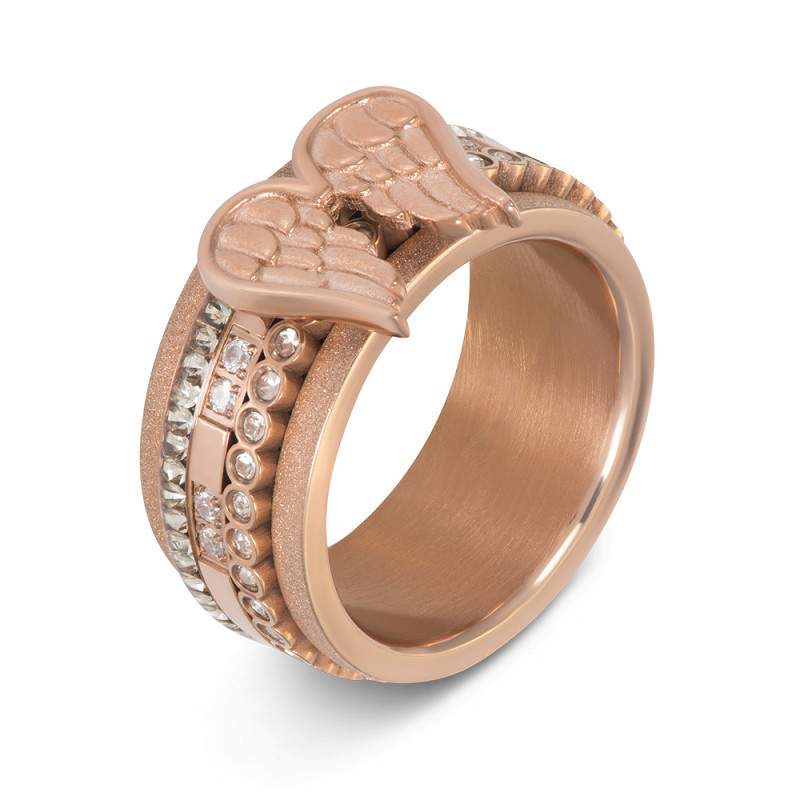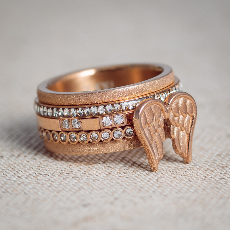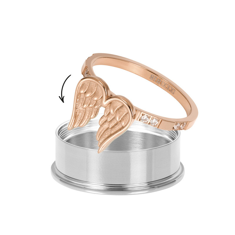 De iXXXi vulring Wings is een 2mm brede vulring gemaakt van stainless steel en is voorzien van een rosé goudkleurige plating. De vulring bestaat uit een gladde, hoekige ring die aan de bovenkant is voorzien van een symbool in de vorm van engelenvleugels. De vleugels hebben een afmeting van 13x11 millimeter. Aan beide zijden van dit symbool bevinden zich vier zilverkleurige zirconia’s. De rosé goudkleurige vulring Wings is verkrijgbaar in de maten 17 t/m 21. Voeg dit mooie symbool toe aan jouw ringcombinatie en hij zorgt direct voor een bijzondere uitstraling. De vulring Wings is ook verkrijgbaar in de kleuren goud en zilver.