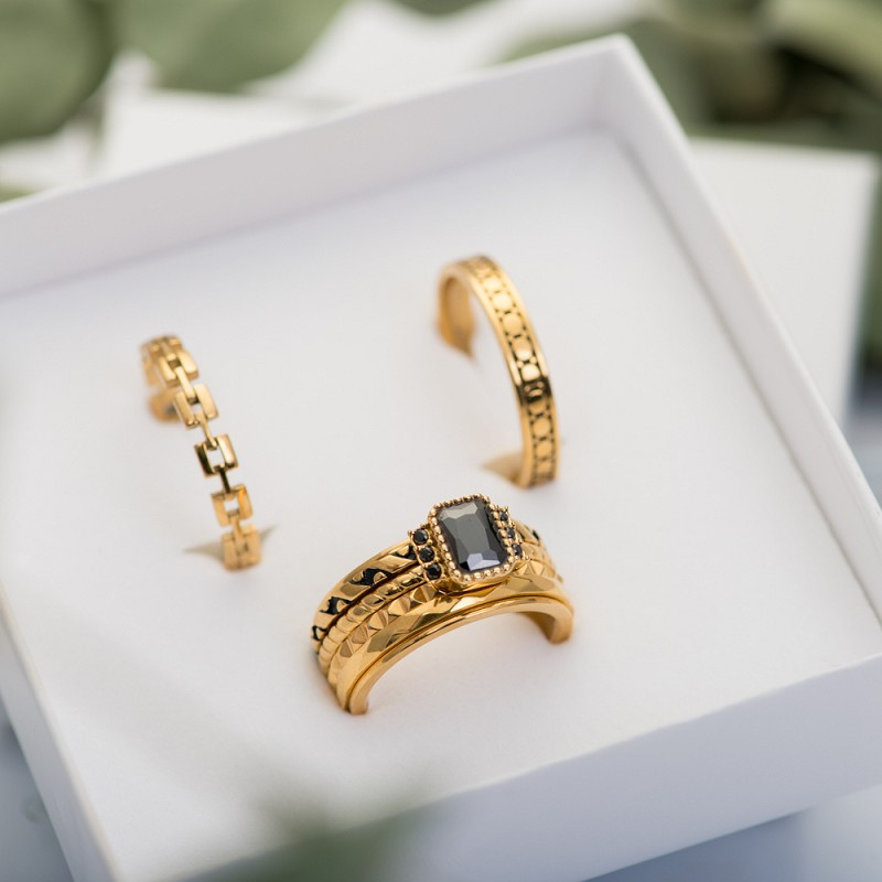 De iXXXi vulring Miracle is een 2mm brede vulring gemaakt van stainless steel en is voorzien van een goudkleurige plating. De vulring heeft een gevlochten design en is bovenop voorzien van een langwerpige, zwarte zirconia steen met aan weerszijde 3 kleine, zwarte zirconia's. De goudkleurige vulring Miracle is verkrijgbaar in de maten 14 t/m 21. Je kunt deze vulringen ook naast jouw iXXXi ringcombinatie als solitaire ringen dragen. Voeg de Miracle ring toe aan jouw combinatie voor een vintage uitstraling. De iXXXi vulring Miracle is ook verkrijgbaar in de kleuren rosé goud en zilver.